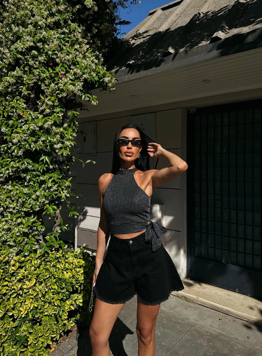 Çizgili Beli Kuşak Detaylı Halter Bluz