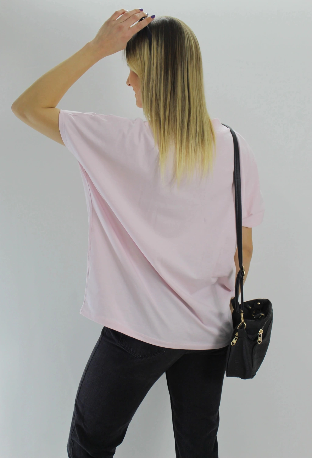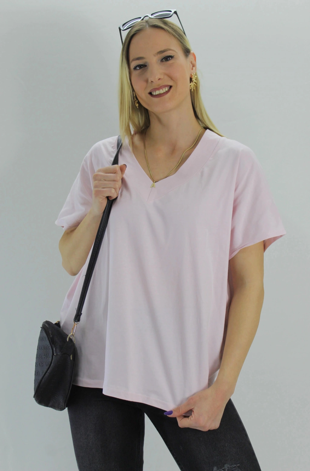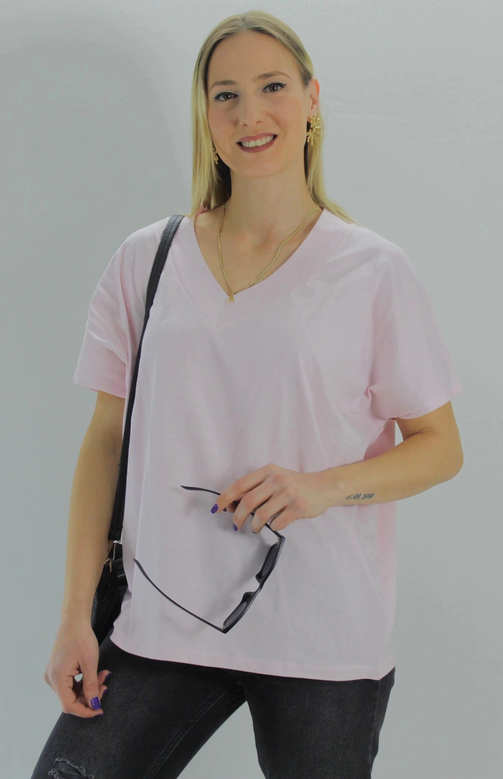 Geniş V yaka Tişört Açıkpembe - 1090.35