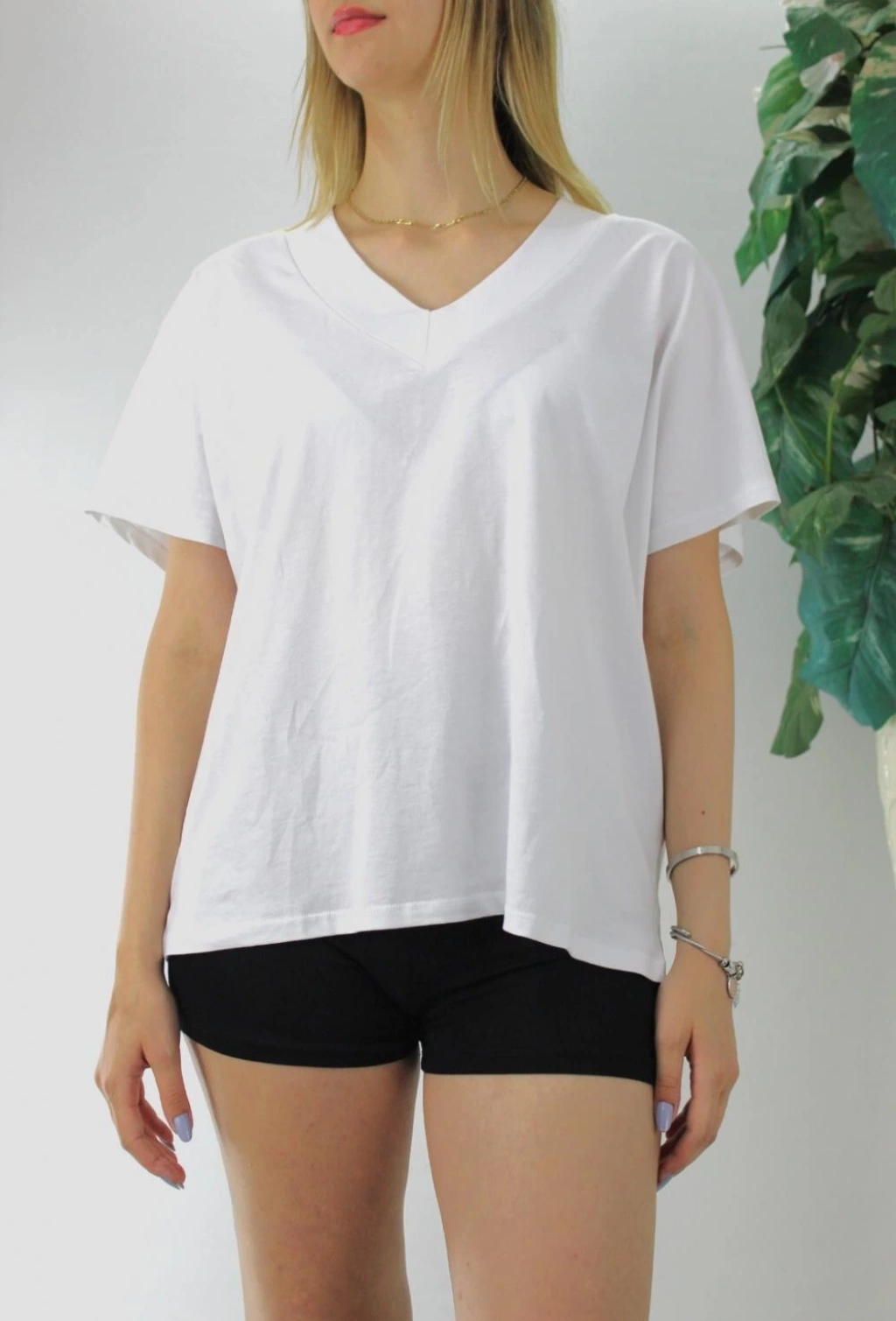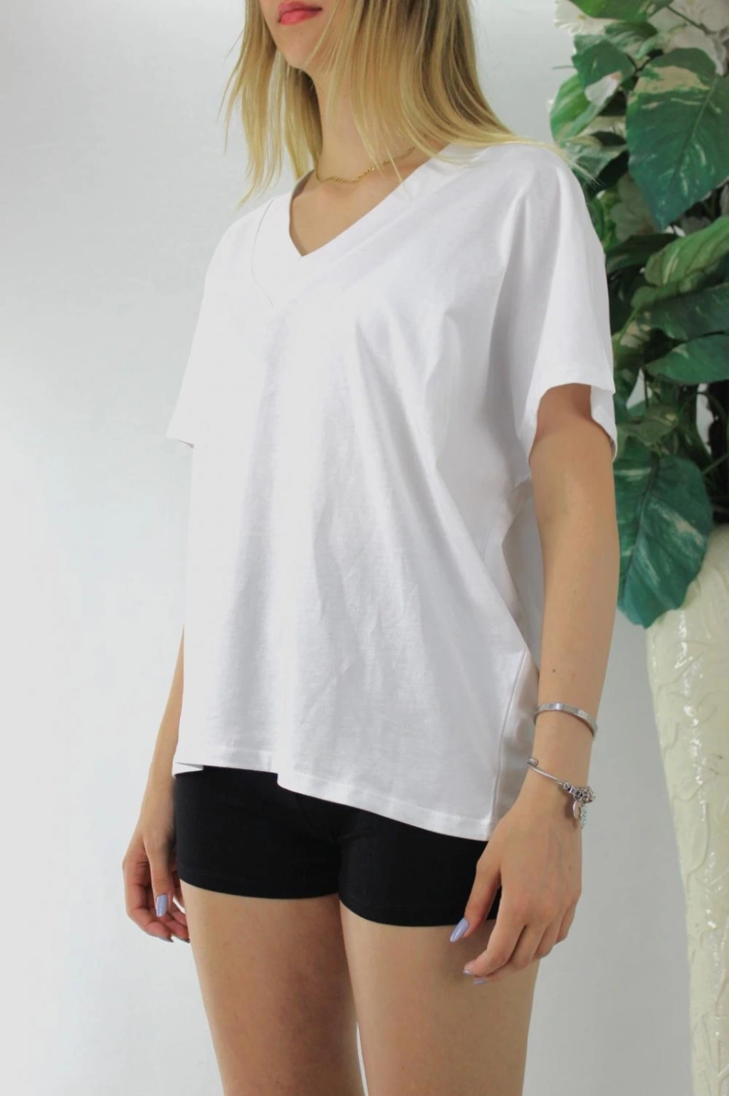 Geniş V yaka Tişört Açıkpembe - 1090.35