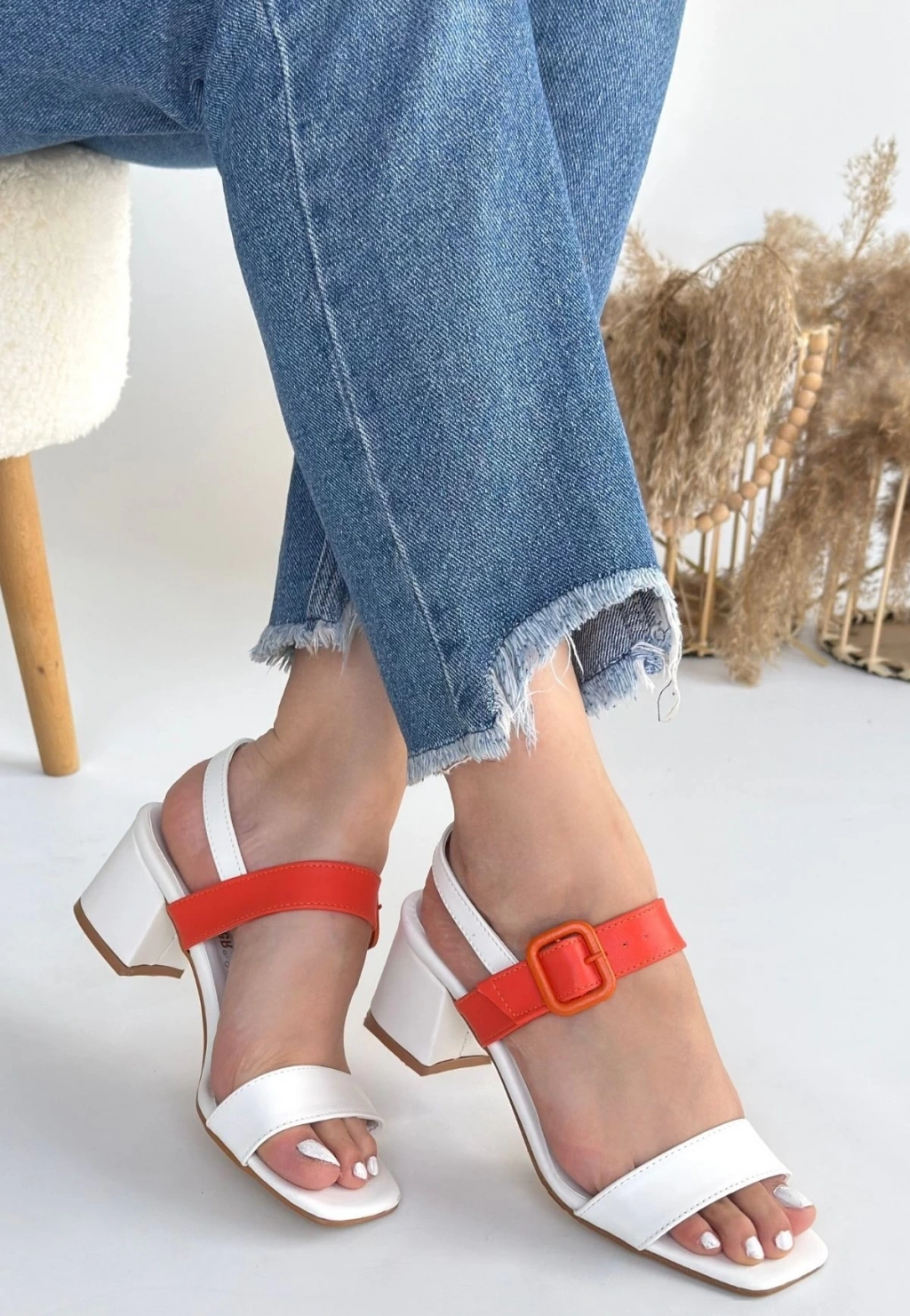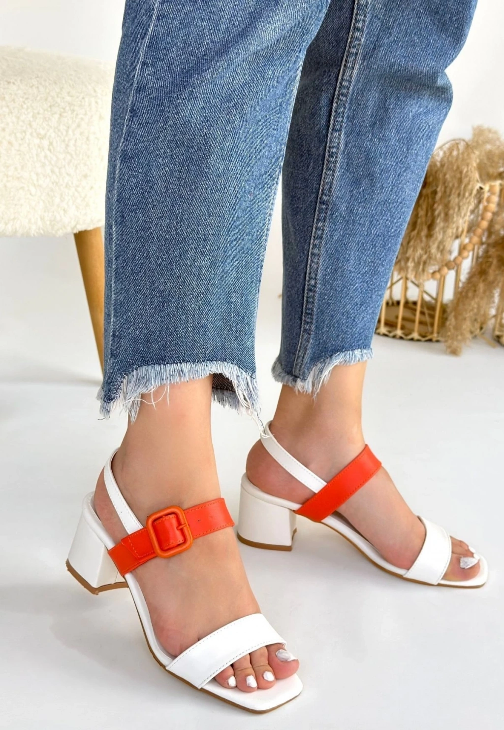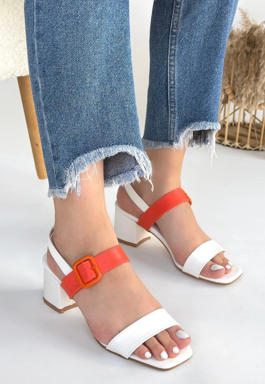 • Year Beyaz Cilt Turuncu Detaylı Beyaz Topuklu Ayakkabı